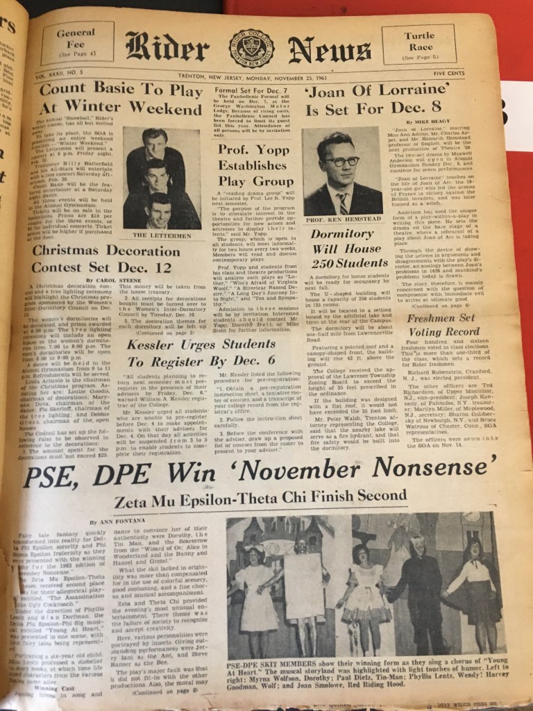 Amazingly, there is a photo in the Rider archives showing Dr. Lally critiquing this front page with Wolfe, but doesn’t mention this fact. And you really can’t see the date in the photo. When I interviewed Wolfe for a Rider University magazine feature 18 years ago, he let the cat out of the bag. I can’t remember his exact words, but he said to me, “This photo shows Professor Lally saying to me, ‘Herb, it’s great that you got the paper out, but you should have probably included something about Kennedy.'”