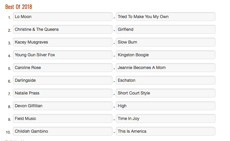 Below is my contribution to WXPN’s Best of 2018 list. While most of what I listen to is popular on WXPN, there is still quite a bit that escapes even their attention. Young Gun Silver Fox’s first album from a couple of years ago got played a bit, but the station ignored their superior 2018 release, which was a shame. And even though I discovered the band Field Music through WXPN’s Indie Music Hit Parade on a Friday night in 2016, they have just never made it into regular rotation. In fact, that may have been the only time Field Music has ever been played on WXPN. But I loved the band because they sound like Talking Heads, XTC, Peter Gabriel/classic Genesis and Prince (yes, Prince…who posted then deleted a tweet approving of their song “The Noisy Days are Over” a few weeks before his death) all rolled up into one. So I doubt they’ll make the list, but I still wanted to acknowledge those acts as the Best of 2018.