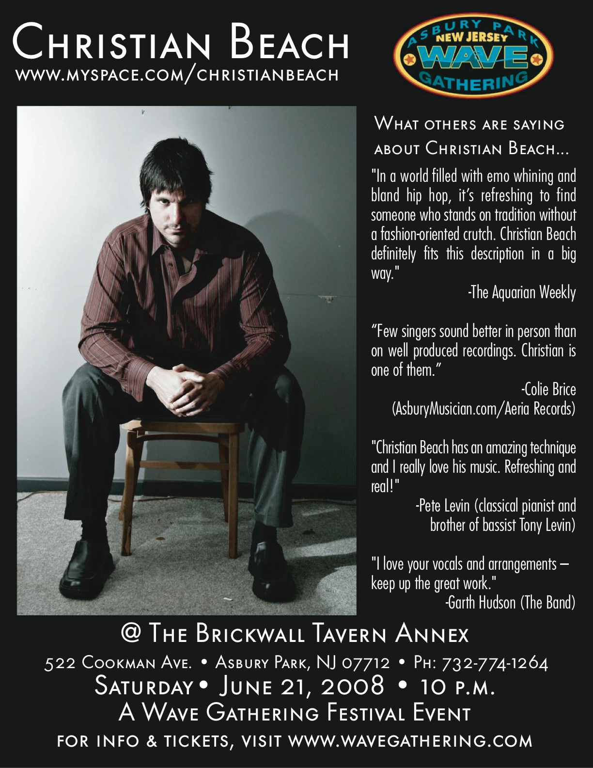 New Jersey singer-songwriter Christian Beach will be doing a solo, acoustic show as part of this year’s Wave Gathering Festival in Asbury Park, NJ. He will be taking the stage at The Brickwall Tavern Annex (522 Cookman Ave.) at 10:15 p.m. (and I may be joining him on accordion for a couple of songs).