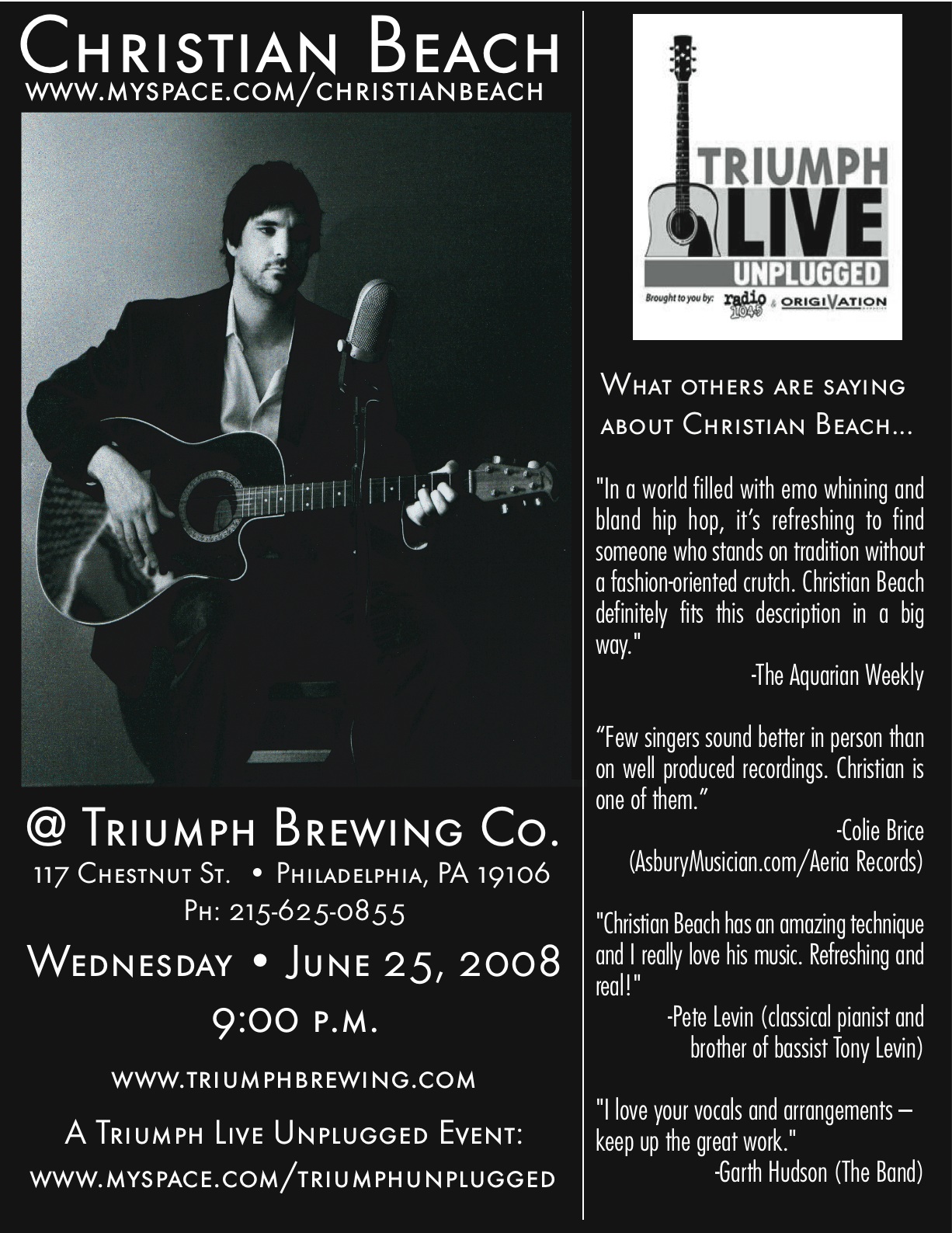 New Jersey singer-songwriter Christian Beach will be performing a solo, acoustic set at Triumph Brewing Company (aka Triumph Brew Pub) at 117 Chestnut St. in Philadelphia on Wednesday, June 25, 2008. He will be taking the stage shortly after 9 p.m. The performance is part of the weekly Triumph Live Unplugged series.